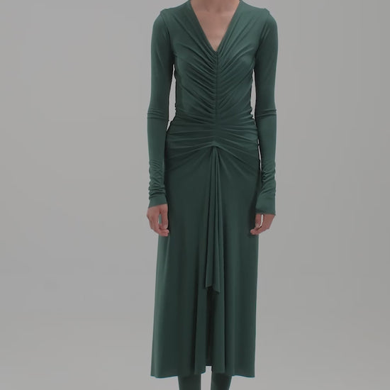 The Cardo Midi Dress features intricate front ruching and a draped skirt, creating a flattering, elongated silhouette. Designed with long sleeves and a deep V-neckline, it transitions effortlessly from day to evening with timeless elegance.