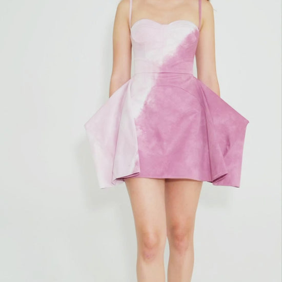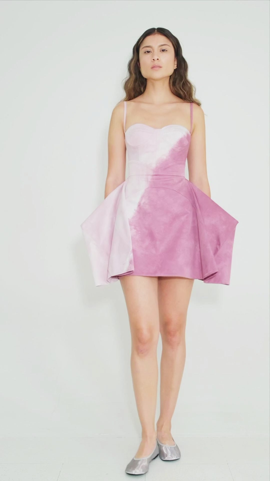 The Huella Mini Dress features a structured bodice with delicate straps and a voluminous skirt, creating a dramatic, sculptural design. Perfect for making a statement, it combines boldness with a touch of elegance.