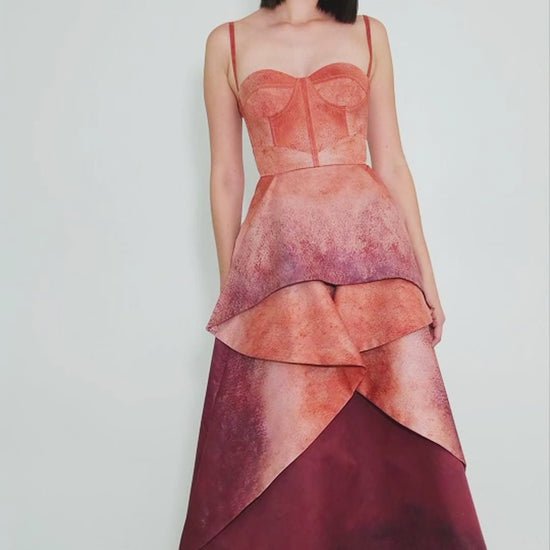 The Momento Midi Dress exudes elegance and drama with its structured bodice and cascading high-low skirt. The fitted silhouette accentuates the waist, while the layered design adds movement, making it perfect for special occasions or evening events.
