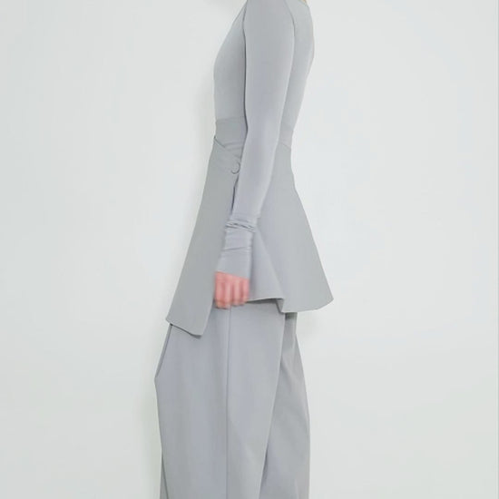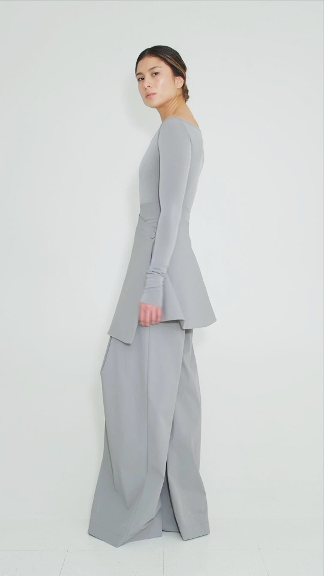 The Paso Vinculo Set combines a classic tailored pant with an overlaying mini skirt, creating a bold silhouette that blends functionality with elegance. The clean lines of the pant offer timeless structure, while the skirt overlay adds a playful touch.